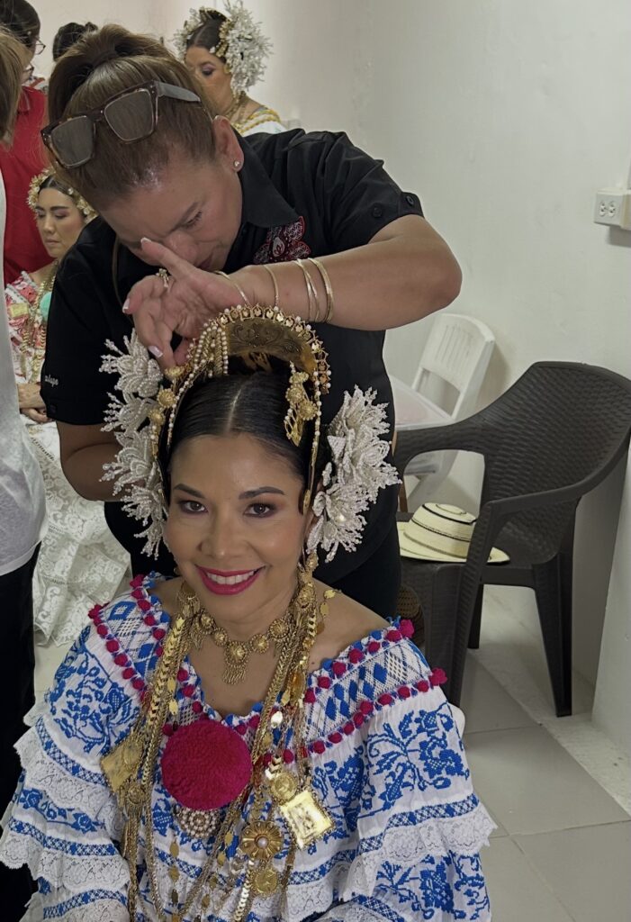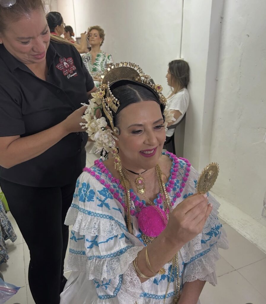 La experiencia de que me vistieran, me pusieran los tembleques, me maquillaran… fue hermosa. Una hora y media se dedicaba como mínimo a cada una. Un trabajo cuidadoso y hecho con mucho cariño. Cuando me vi en el espejo me sentí feliz y entendí por qué se dice que toda mujer panameña debía lucir una pollera. Me sentía en las nubes.